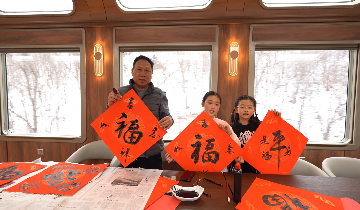 在會議車廂,司乘人員為乘客準備了筆墨紙硯,大家紛紛拿起毛筆,揮毫潑墨。一副副春聯(lián)和福字在大家的筆下誕生,有的蒼勁有力,有的清新秀麗,為蛇年春節(jié)增添了文化氛圍。心靈手巧的游客還拿起剪刀,將一張張紅紙剪成各種各樣的圖案,這些精美的剪紙作品不僅是藝術(shù)品,更是游客對新年的美好祝福。