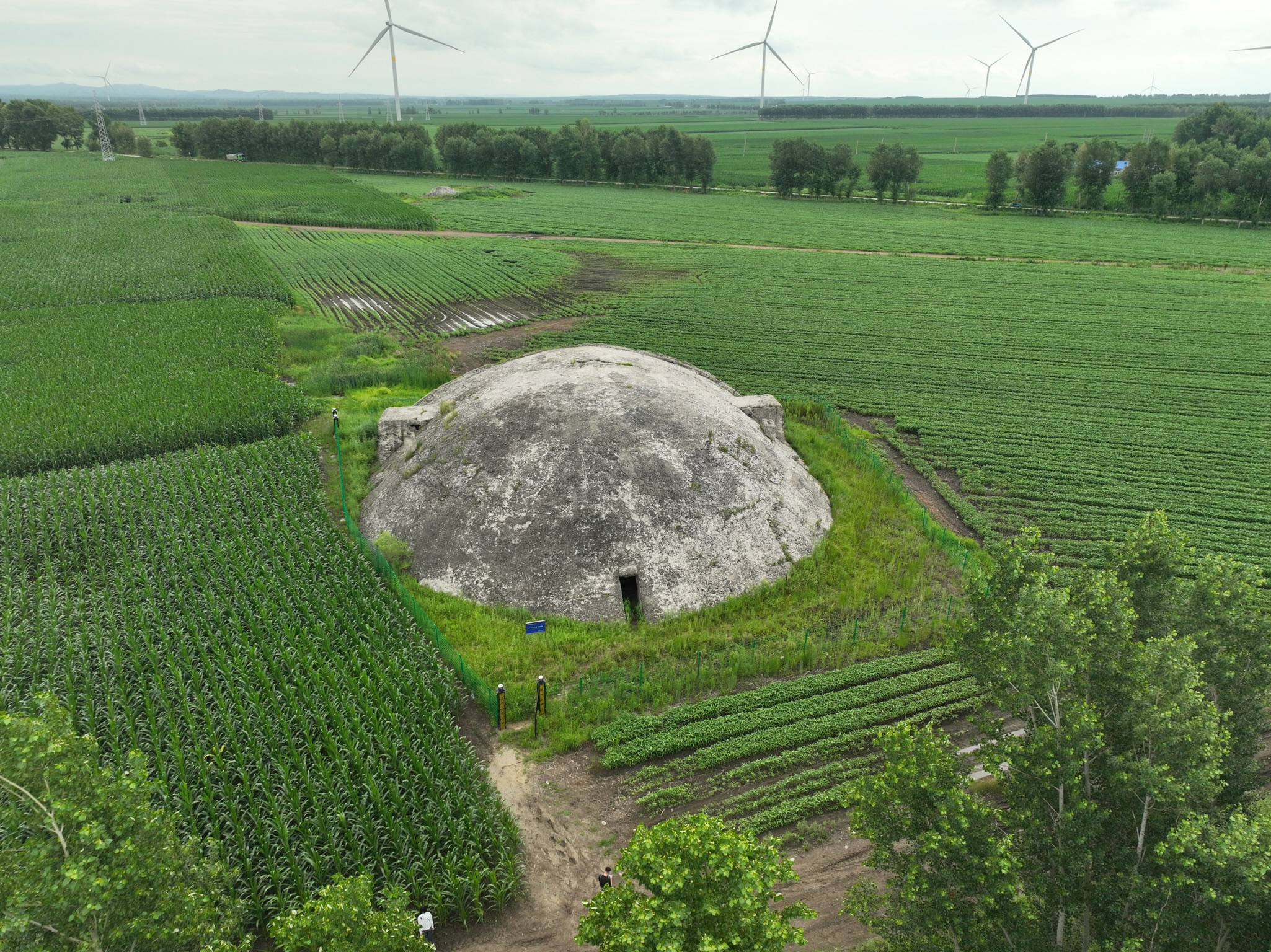 向土龍山鎮(zhèn)東行約1.5公里,一座形似巨大頭盔的混凝土建筑突兀地蟄伏于曠野——這便是“土龍東門外飛機堡”遺址。它是當年日本為侵略擴張所建龐大機場網絡中僅存完整的飛機庫,直徑逾10米,墻體厚達60厘米,冷硬地矗立了八十余載。