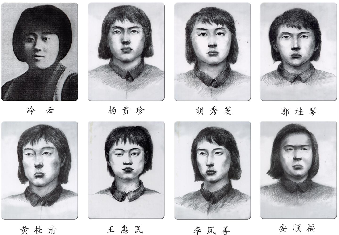 請記?。核齻兪枪伯a(chǎn)黨員、抗聯(lián)二路軍五軍婦女團(tuán)指導(dǎo)員冷云,共產(chǎn)黨員、五軍婦女團(tuán)班長楊貴珍、胡秀芝,五軍婦女團(tuán)戰(zhàn)士郭桂琴、黃桂清、王惠民、李鳳善(朝鮮族)和二路軍第四軍共產(chǎn)黨員、被服廠廠長安順福(朝鮮族)。